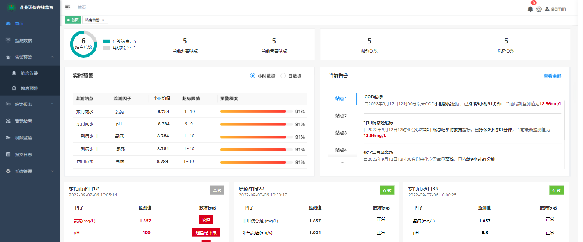 可視化管理:通過(guò)模擬企業(yè)監(jiān)測(cè)站房,實(shí)時(shí)展示站房當(dāng)前環(huán)境狀態(tài)、設(shè)備聯(lián)網(wǎng)情況及污染因子實(shí)時(shí)監(jiān)控?cái)?shù)據(jù),通過(guò)平臺(tái)可實(shí)現(xiàn)設(shè)備的遠(yuǎn)程反控;
